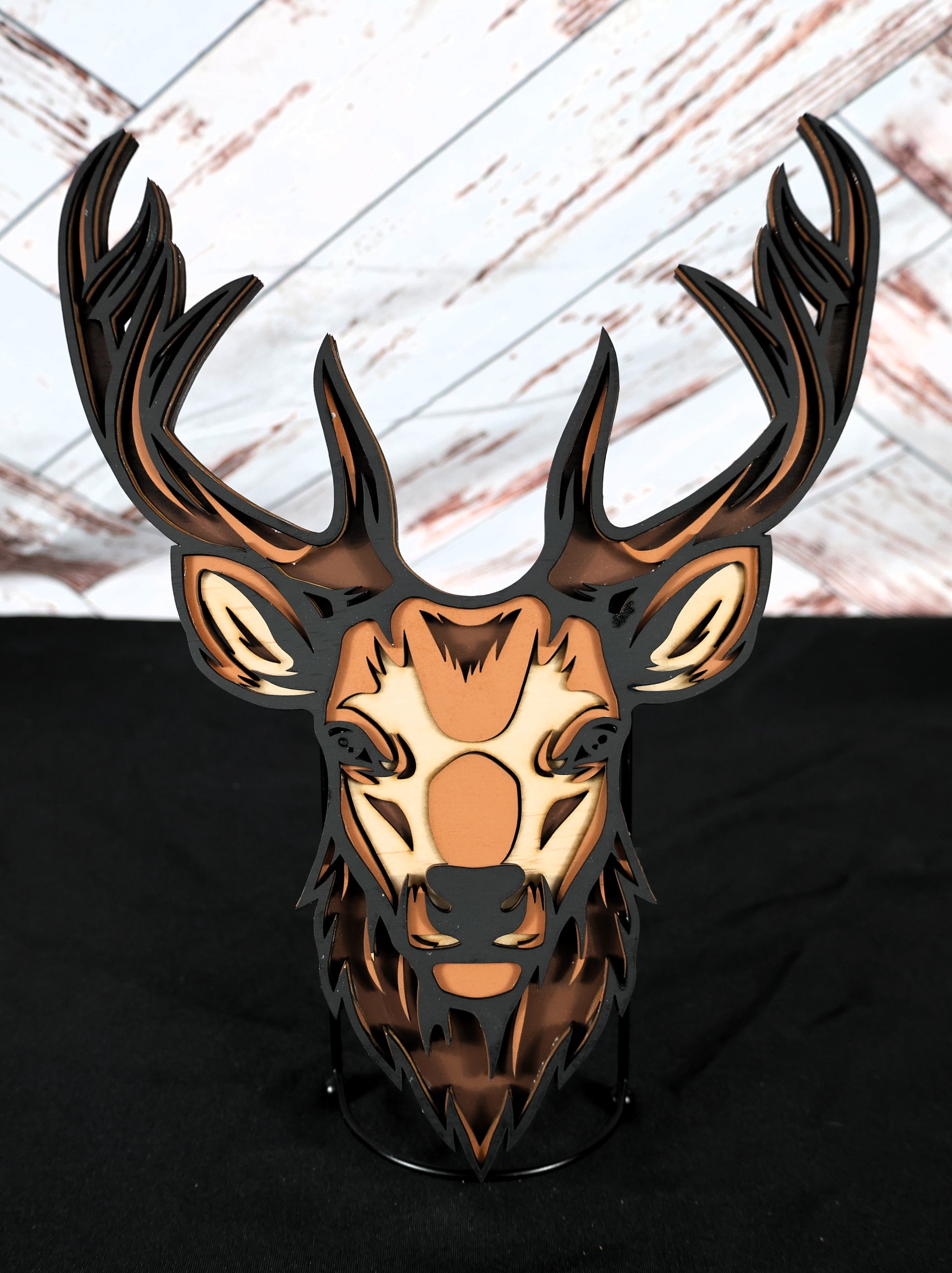 This charming laser-cut deer head brings woodland whimsy to any space! Crafted with multiple dimensional layers and finished in earthy, natural tones, it's a delightful statement piece that celebrates nature's beauty. Standing 12 inches tall and 9.5 inches wide, this decorative accent features a convenient rear mounting point for easy display on your wall. Perfect for adding rustic charm to a cabin, nursery, or nature-loving home.
